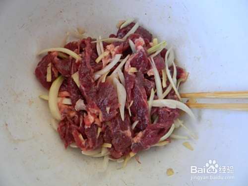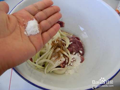加入适量盐。一汤勺料酒,适量黑胡椒粉,一汤勺淀粉,一汤勺食用油,再加一点点小苏打,我手上的就是小苏打,调料勺半勺。