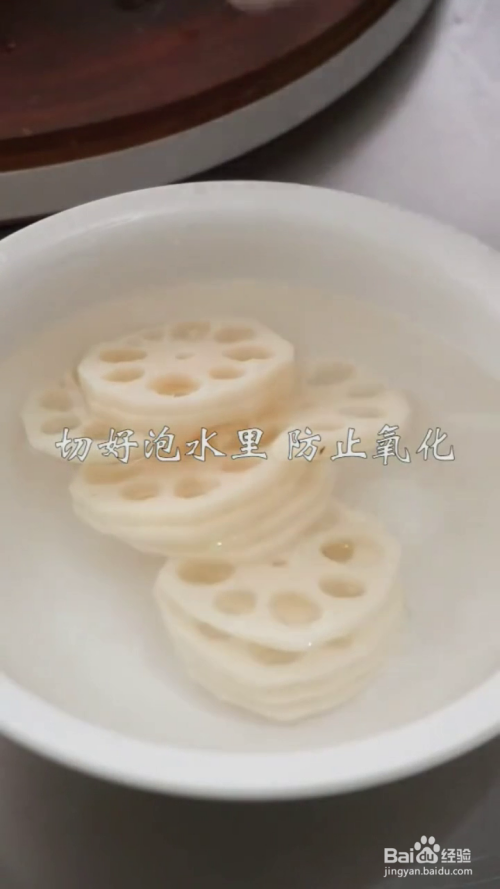 我们将藕洗净削皮切片,浸泡在水中防止氧化变黑