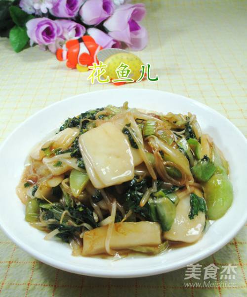 接着,合入已清洗好的绿豆芽和年糕片,加少许清水翻炒翻炒。