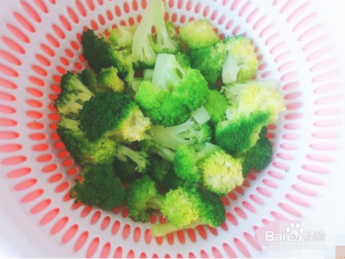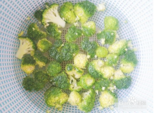 西兰花掰成小朵,清洗干净后,在盐水里浸泡10分钟,然后再多冲洗几遍,沥干水份。
