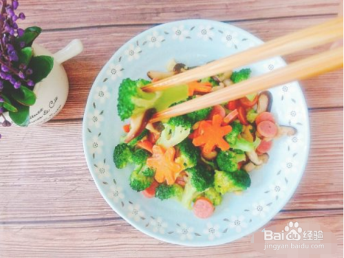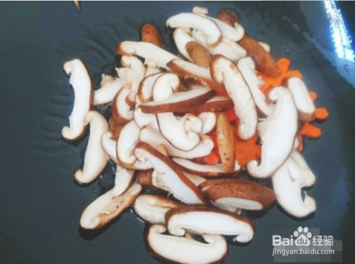 将锅烧热倒油,煸香蒜末后下入胡萝卜和香菇翻炒见软。