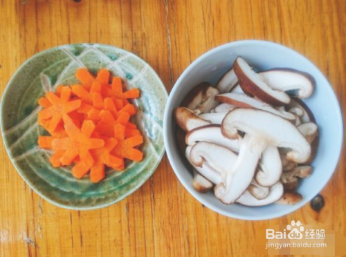 胡萝卜切成小花形状,如果切不好的话也可以借助压花模具或直接切成菱形片。鲜香菇洗净切片。