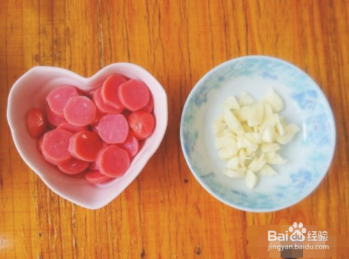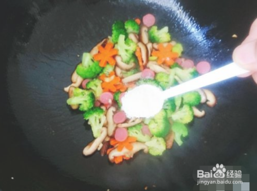 放入香肠片,撒进食盐调味,再倒点白砂糖提鲜,翻炒均匀后便可出锅食用。