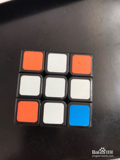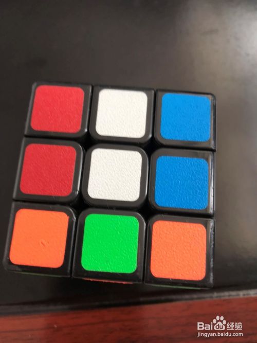 橙色对好以后,将这个面向你的面旋转一百八十度,得到如图所示的样子,就是底面变成两个白色块。