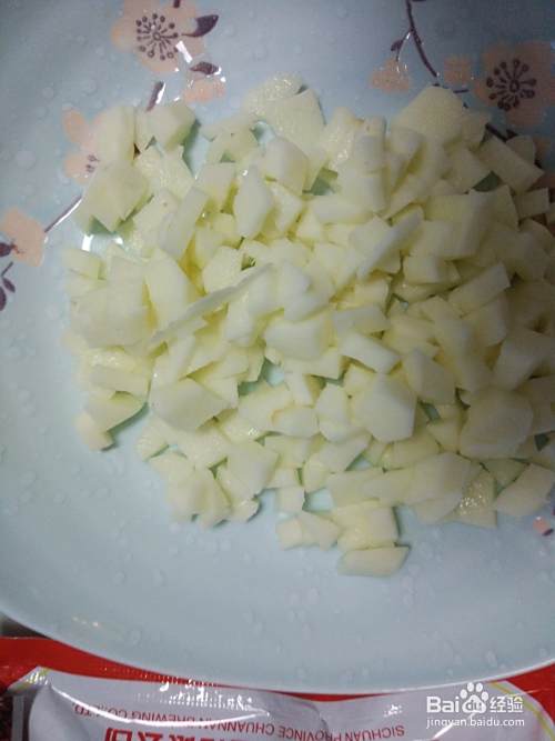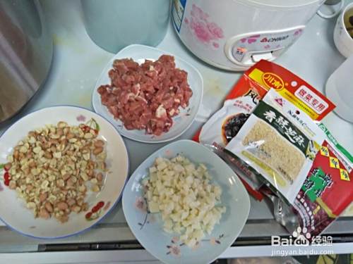 准备好材料后,把牛肉洗干净,切成碎丁,花生米,山药,香菇都要切成碎丁;