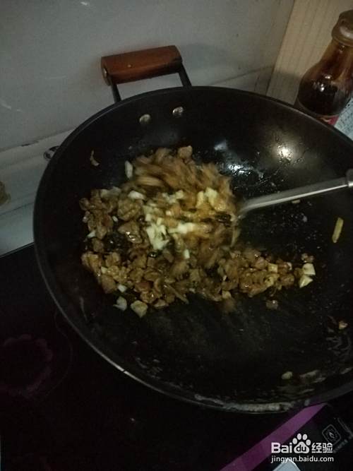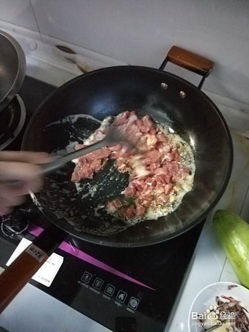 接着放入牛肉丁,翻炒均匀,记得切的时候一定要切的大小适中,这样做出来的牛肉酱才美观,炒的时候放入适量的酱油,可以达到起鲜的作用;