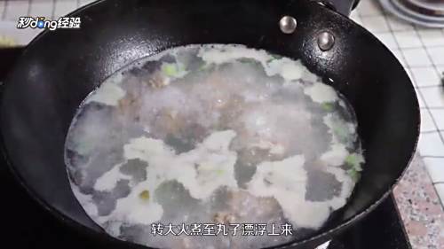 3将搅拌好的肉馅用手团成一个个的小丸子,起锅烧油,放葱花炝锅,加入适当水,大火煮开。