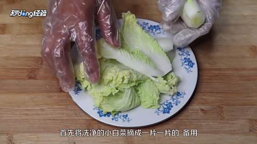 1将洗净的小白菜摘成一片一片的备用,将牛肉剁成肉馅,打入一个鸡蛋。
