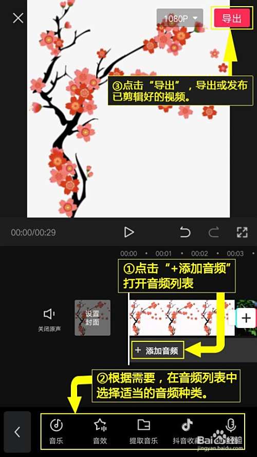 添加音乐。点击音频轨道左端的“添加音频”,选择“音乐”(或“音效”、“提取音乐”、“抖音收藏”、“录音”等),为视频添加声音,最后点击“导出”,导出已剪辑好的视频。