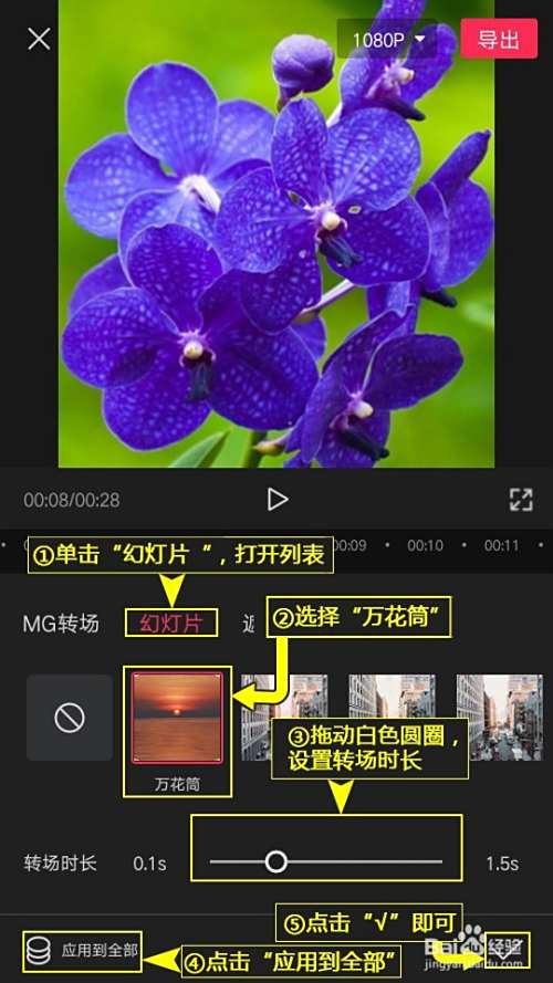转场设置。单击“幻灯片”,打开列表,选择“万花筒”,设置转场时长,点击“应用到全部”,最后点击右下角的“√”即可。