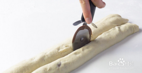 用剪刀在面团卷上依序剪出斜切口,每一刀约间隔2.5公分,不要直接剪断面团。然后在每个切口处将面团左右拉开,一边向外、一边向内,形成麻花状。