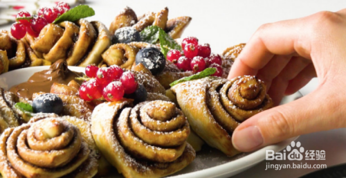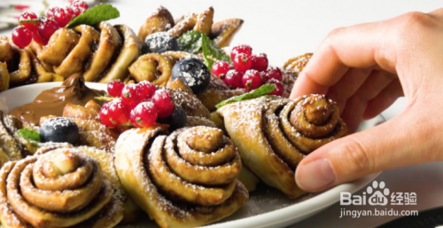 接下来就是装饰部分了,出炉后,在表面撒上糖粉,麻花卷上放几颗红醋栗、蓝莓或薄荷叶装饰,中间摆一盘巧克力榛果酱。你的吸睛甜点就完成了。