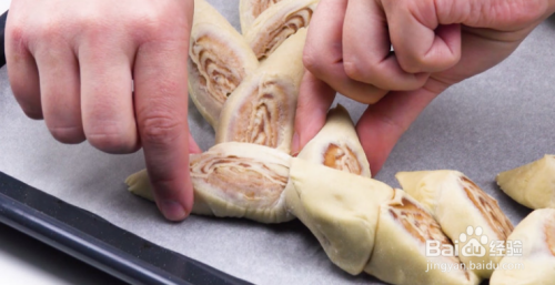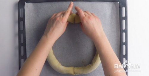 将面团卷放在铺烘焙纸的烤盘上,两侧连接在一起形成圆圈。