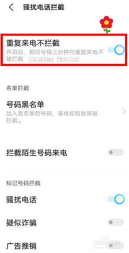 点开【重复来电不拦截】右侧的开关按钮即可。
