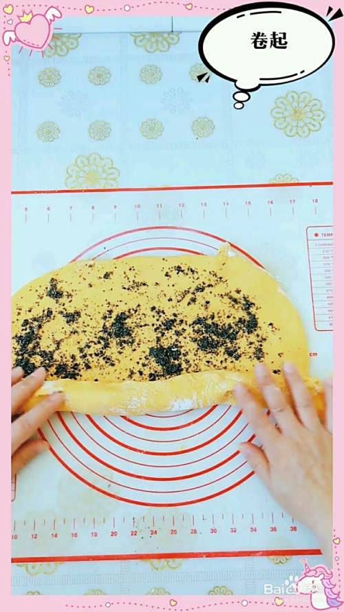 把面团擀成大饼状,撒上熟黑芝麻粉,在撒点盐,卷起