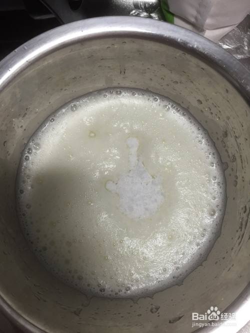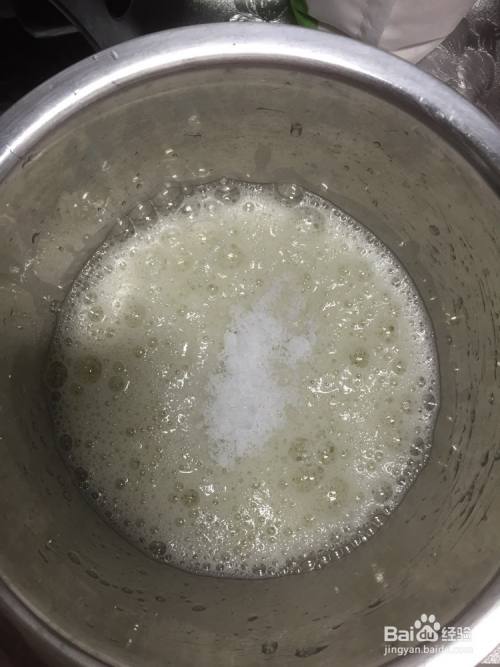 在蛋清中挤入几滴柠檬汁,打到图中状态—鱼眼泡时,加入20g白糖,继续打发。