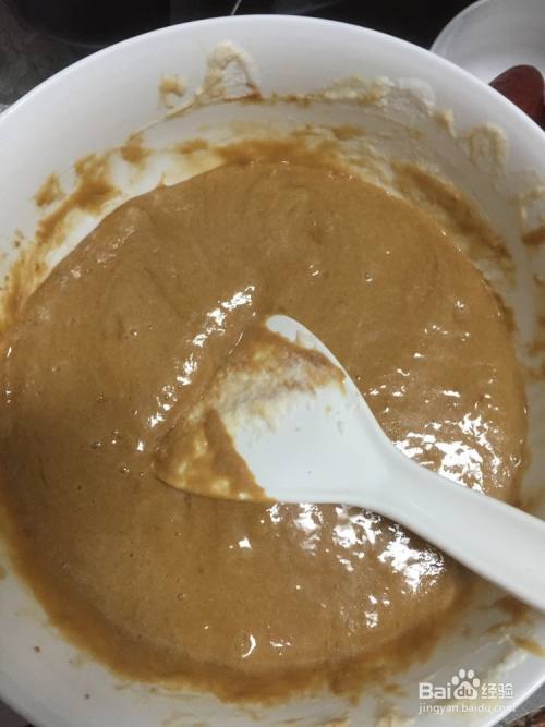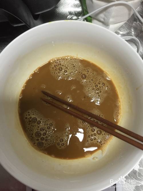 蛋黄牛奶糊中加入红糖,搅拌均匀。红糖比较不好融化,我就烧了半盆水,温热就行,别烫手,把大碗放进水盆,慢慢红糖就化开了。