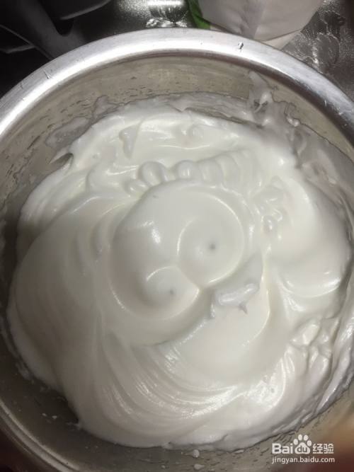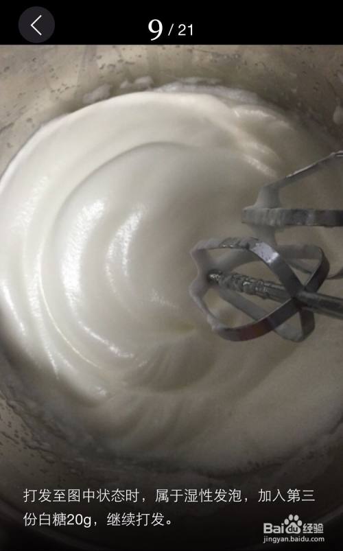 由于我忘记拍这步了,就传一张我原来菜谱里的,打到湿性发泡时,就是刚有纹路,加入白糖20g,继续打发。