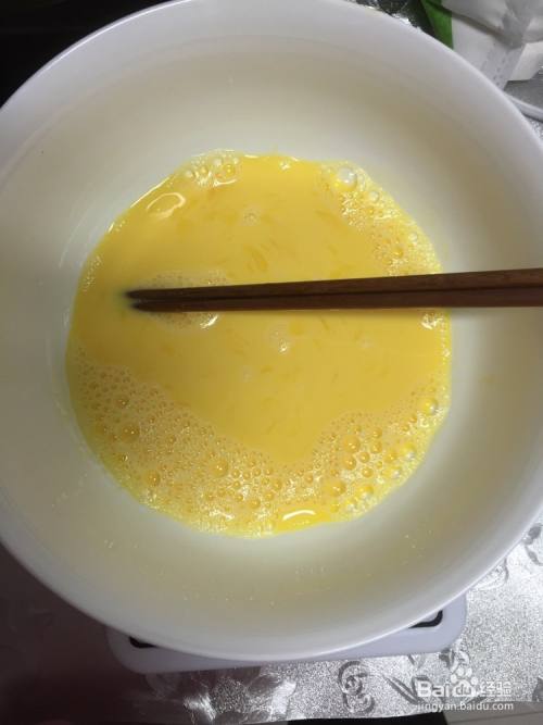 蛋黄打散后加入牛奶搅拌均匀。