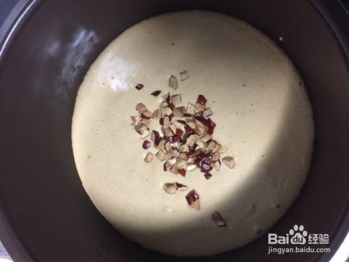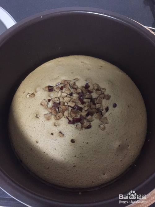戴上隔热手套把电饭煲内胆拿出,倒入蛋糕糊,在表面撒上剩余的红枣丁,轻震几下。