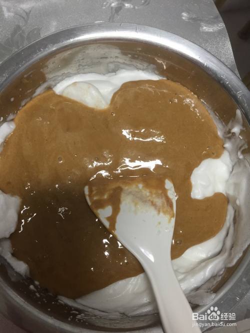 电饭煲刷薄薄的一层油热五分钟。先取三分之一蛋清放入蛋黄糊中翻拌均匀,千万别画圈搅拌。然后把拌好的蛋黄糊倒入剩下的三分之二蛋清中,翻拌均匀。