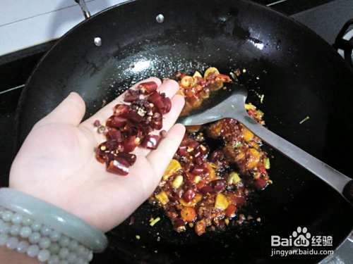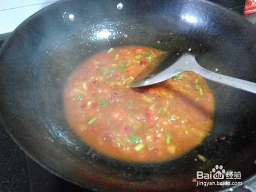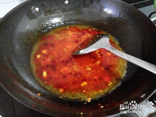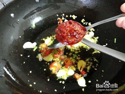 炒锅烧热倒适量的食用油烧好,放姜蒜葱白一半的红椒炒香,放豆瓣酱小火炒出红油