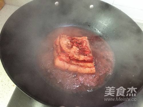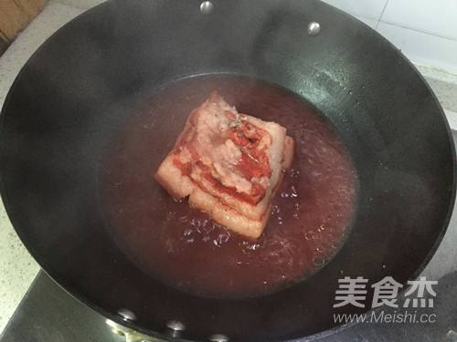 6将肉皮翻朝下,中小火慢烧焖1个小时至肉酥烂。