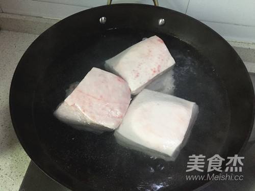 1准备材料。正方形的三层五花肉洗净。锅里加入清水,烧开后放入五花肉,转中火,煮透,去净血沫。(我只用了一块五花肉,其余的做焖肉了)