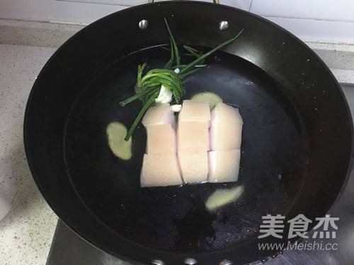3锅里放入水,水漫过肉块,放入姜,葱。肉皮朝上。
