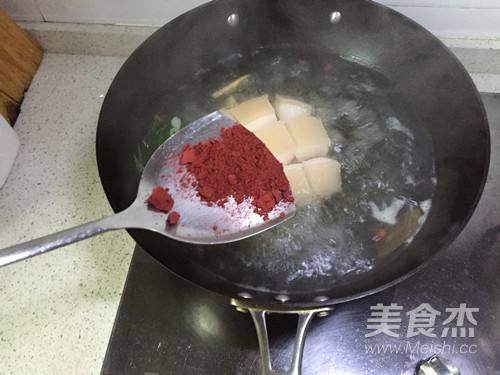 2捞出洗净,皮朝上放在菜板上晾凉,用刀在皮上纵横切成樱桃大小的方形块,底部不要切断。