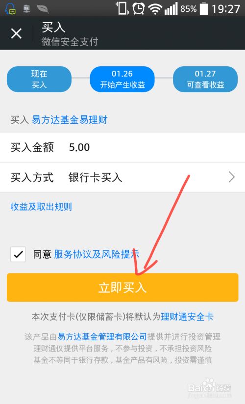 输入买入的金额,也就是需要投入的理财的本金。并勾选同意服务协议与风险提示。点击“立即买入”。