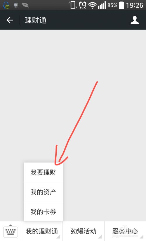 进入微信理财通公众号后,点击我的理财通。弹出菜单中选择我要理财。