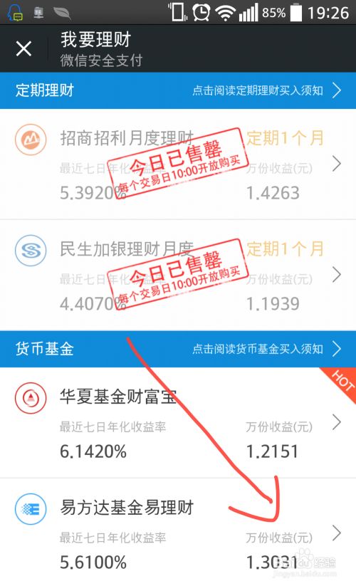 使用微信绑定了银行储蓄卡开通了微信支付功能的用户,可以使用微信理财通进行理财。如购买基金,短期的基金只需要一个月可以拿回本金与收益。与支付宝钱包的余额宝类似只是周期长一点,不能随时取出本金,但收益也就相对高一些。笔者也是试着体验了一下,并未真正大量投入资金理财,所以也不多说一些深刻体会了,只是一般操作步骤供参考。投资理财需要慎重考虑。