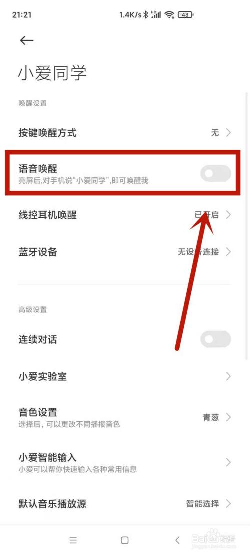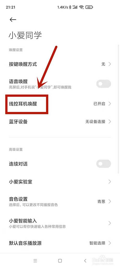 将线控耳机唤醒开关后的按钮点击关闭,即可成功操作。