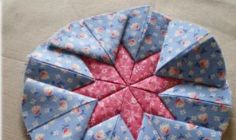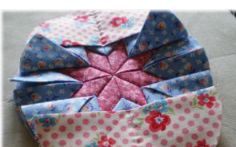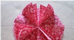 第三步:再将4片蓝色花布按照刚才红布料的中线部位,再缝合上去。依旧也向中线折好