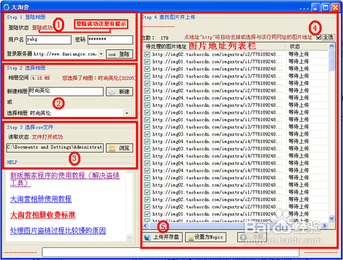 选择要处理的CSV文件,然后工具会列出要搬家的图片地址清单,然后点右上角的全选,再点上传并存盘,等待工具处理完毕,弹出窗口,经过处理后,CSV文件里引用的图片全部都搬到了大淘营相册里,然后用处理后的数据包再上传就不会出现“您不能使用他人图片空间中图片” 的问题了