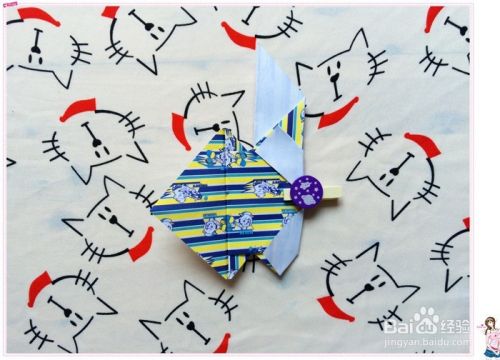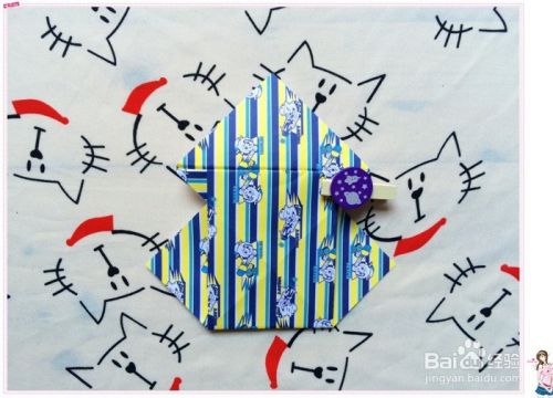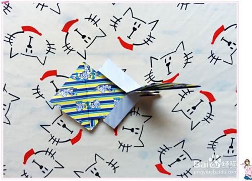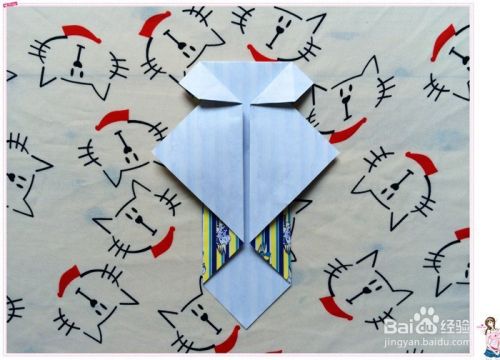 然后再把花色那面的对应的两个角分别都往白色这面折,角正好落在它们往反面折的折痕中点处。