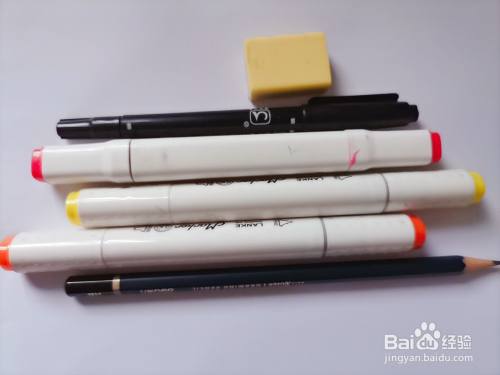 准备好我们要用到的材料:一支铅笔、一块橡皮、一支勾线笔(含有粗细两头)、一些马克笔和一张白纸。
