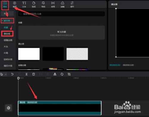 第一步,点击媒体菜单中的素材库按钮,添加黑白场背景;