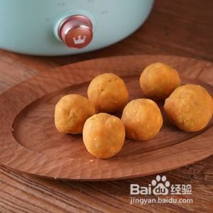 面团分成6等份的小剂子,取一个按扁压大后放入红薯芝土球