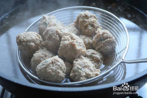 4、锅中烧开水,然后关到最小火,锅底微微冒泡即可,再把丸子一个个挤进去,然后盖上锅盖小火慢慢煮开,大约煮3-5分钟左右,捞出来备用;