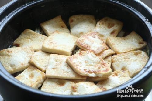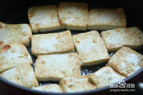6、然后把豆腐放在平底锅煎至两面金黄色,平底锅提前刷一层植物油;
