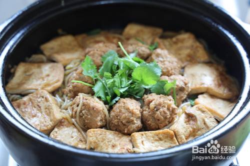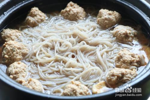 11、加入没过豆腐的清水,再把粉条放进去,肉丸也放进去;