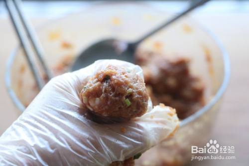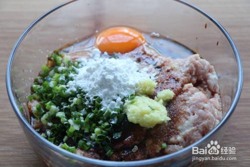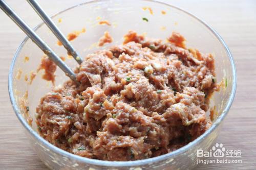 1、准备肉馅儿。买现成的肉馅儿或是自己剁馅儿都可以,把肉馅儿放在碗中,加入以下的调料:生抽1勺 蚝油1勺 老抽半勺 生姜末3克 小葱1把 料酒1勺 胡椒粉2克 鸡蛋1个(小)淀粉1勺;