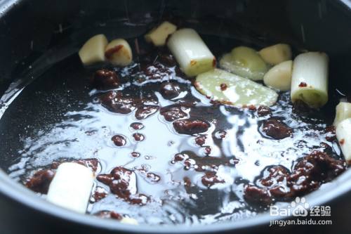8、砂锅里加入植物油,油热后加入葱姜蒜炒出香味,再加入1勺豆瓣酱翻炒出红油;