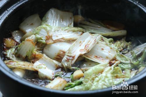 9、再把白菜放进去(白菜提前洗净,用手掰成小块)然后加入盐、生抽、老抽、蚝油翻炒均匀;