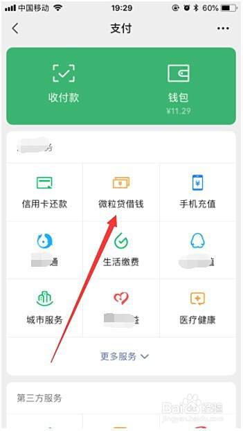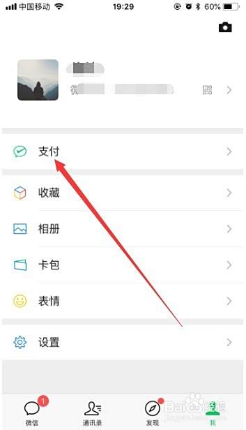 打开登录手机上面的微信后,点击“我”->“支付”,如图所示。