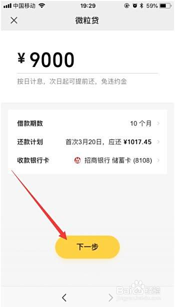 设置借款期数,还款计划,收款银行卡,点击“下一步”,如图所示。