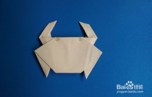 把折好的小螃蟹折纸,翻转过来,压平整,然后用彩铅笔在纸的上方画两个小眼睛,这样可爱的小螃蟹就做好了,如下图所示。