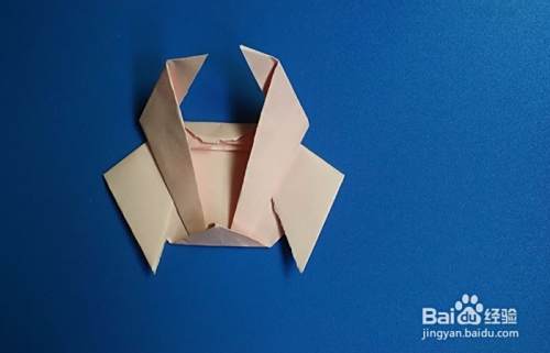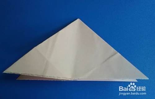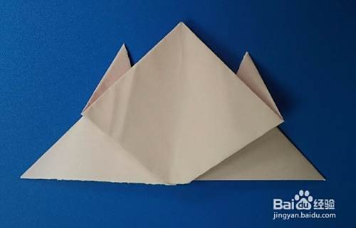 然后将其翻转过来,把底部的三角形向上方折叠,左右两边的边按折痕线向中心折叠,这是做小螃蟹的钳子,如下图所示。